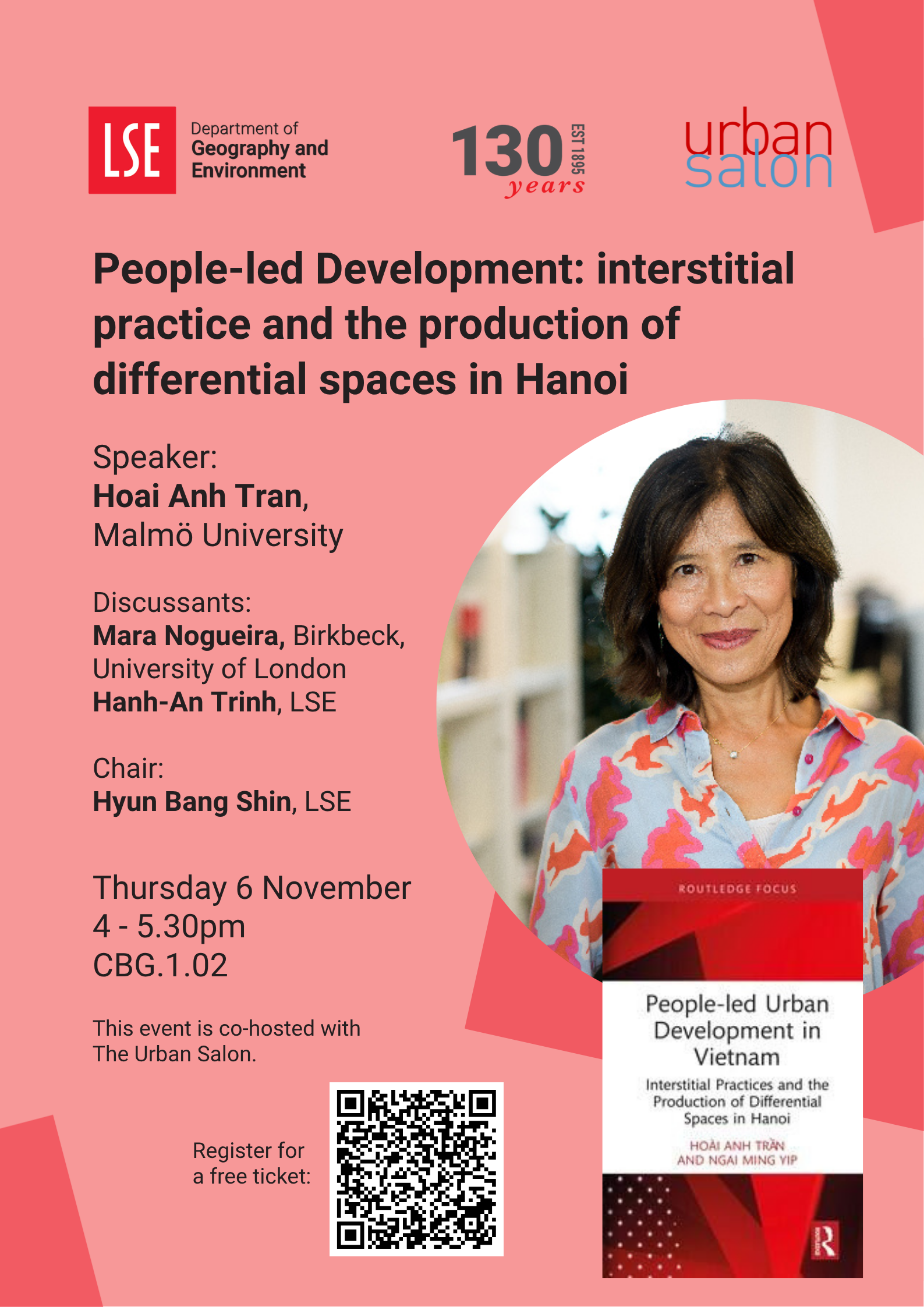 In this event, Hoai Anh Tran presents key discussions in her recently published book People-led Development: Interstitial Practice and the Production of Differential Spaces in Hanoi (2026, Routledge), co-authored with Ngai-Ming Yip. Using Hanoi as a case study, the book explores city-making with a focus on activities carried out by ordinary people.